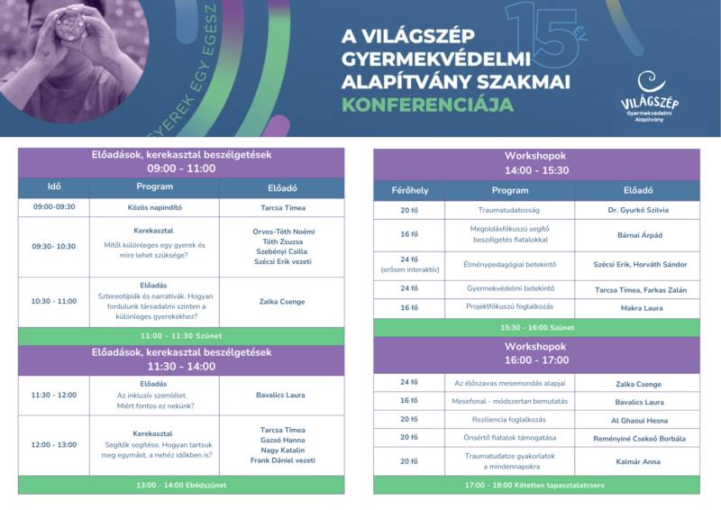 A Világszép Gyermekvédelmi Alapítvány fennállásának 15. évfordulója alkalmából rendezzük meg az „Egy gyerek egy egész világ – Hogyan lehet a Világ Szép egy különleges gyermek számára is” című szakmai konferenciát 2026. május 19-én. Célunk, hogy megosszuk az elmúlt másfél évtized során szerzett tapasztalatainkat, és bemutassuk, hogyan tudjuk támogatni a gyermekvédelmi szakellátásban élő gyerekeket az óvodás kortól egészen az önálló életkezdésig. A konferencia keretében arra keressük a választ, hogyan tehetjük a világot szebbé minden „különleges” gyermek számára, és bemutatjuk saját, valamint partnerszervezeteink szakmai módszertárát.